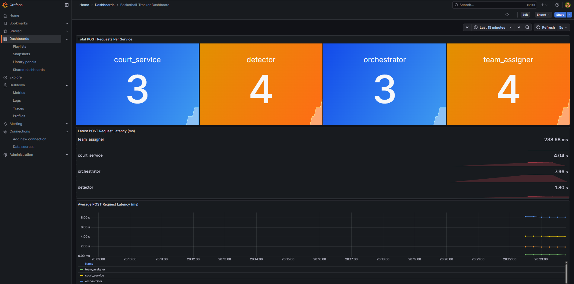 HoopVision is implemented as a containerized microservice application orchestrated via Docker Compose. The full stack consists of 11 services, integrating computer vision inference, data storage, orchestration, visualization, and monitoring.