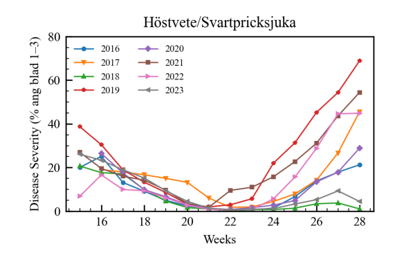 Another important feature for pest prediction, leaf wetness duration, is not included by SMHI but could be estimated from available weather data. The sensitivities of different diseases for different crop strains also showed promise but were removed due to missing values for certain combinations.