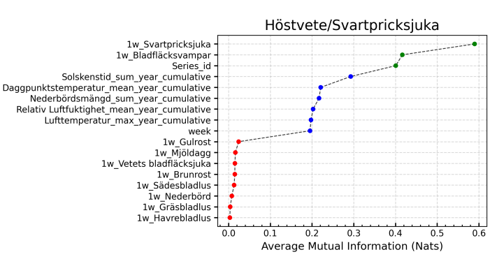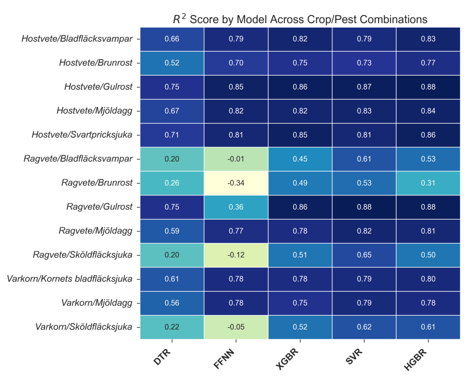 Models performed worst on the rågvete dataset, with the FFNN model conspicuously underperforming, sometimes obtaining negative \(R^{2}\) scores. This is likely due to the small size and complexity of the rågvete dataset, which did not provide sufficient data points for the models, particularly neural networks, to capture the variation in the target. The lack of mutual information between features and the target in some combinations, like rågvete/brunrost, also contributed to poor performance. Similarly, low performance on combinations involving sköldfläcksjuka as a target was observed, which figures 5 and 6 also attribute to insufficient meaningful correlations.